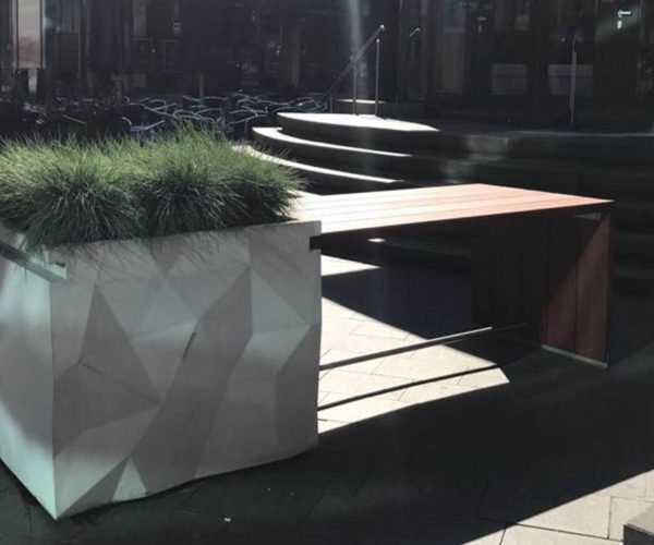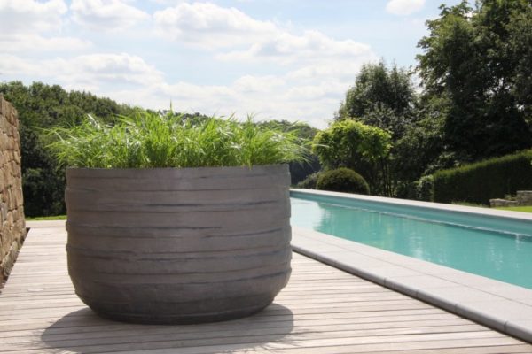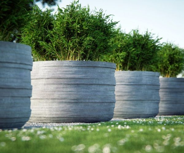 Donica Leocadia betonowa. Występuje w trzech podstawowych kolorach: białym, szarym oraz czarnym. Donica produkowana jest w standardzie z otworami odpływowymi.