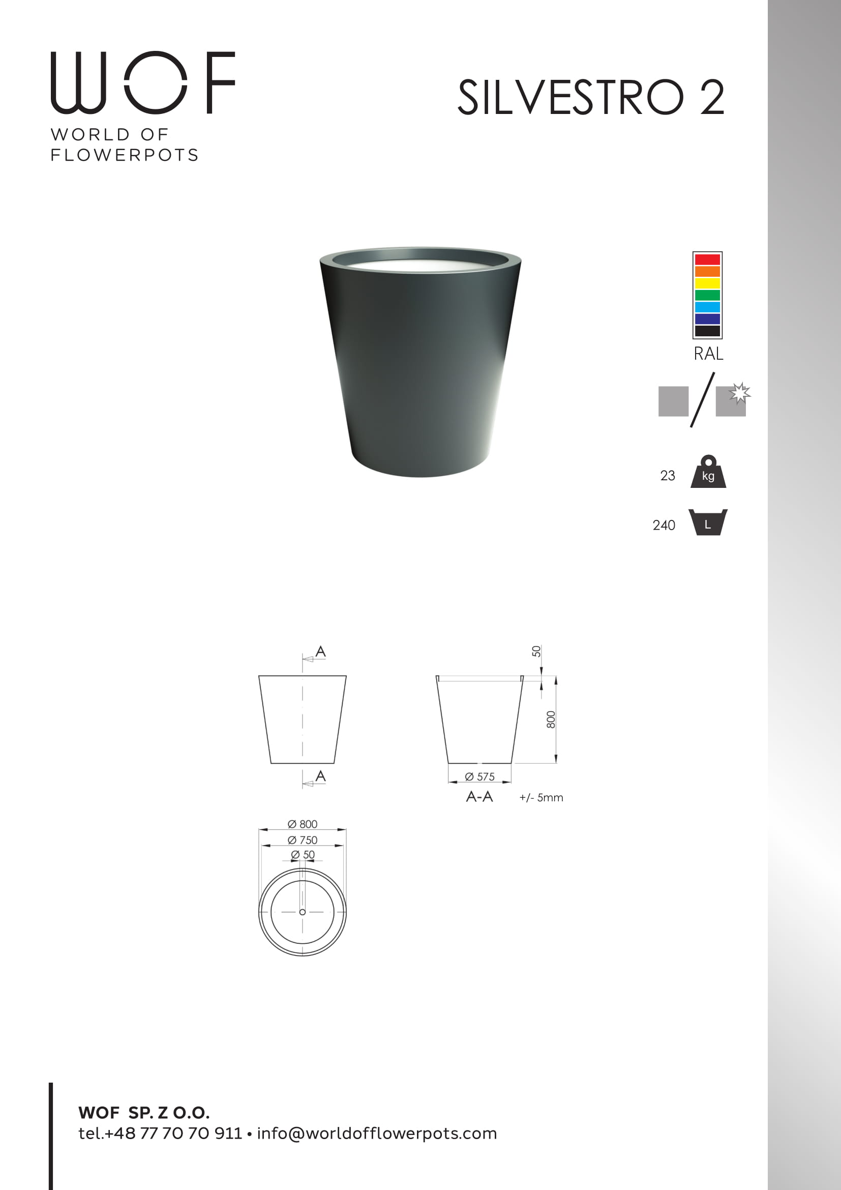 Bardzo ciekawą propozycją z pewnością jest aluminiowa donica stożkowa Silvestro 2. Jest ona produkowana we wszelkich kolorach palety RAL. Co pozwala na dowolne dopasowanie do indywidualnych preferencji. Donica jest dosyć duża, ma kształt stożka o średnicy 80 cm i wysokości 80 cm. W dnie donicy znajduje się otwór odpływowy zapewniający odpływ nadmiaru wody. Opływowy kształt donicy świetnie prezentuje się w patiach biurowych, oraz tarasach. Aluminium, z którego ją wykonano jest najwyższej jakości dzięki czemu donice są odporne na wszelkie warunku atmosferyczne, mrozy, silne opady deszczu, śniegu, czy wysokie temperatury. Aluminiowa donica stożkowa doskonale prezentuje się w zestawieniu z roślinami ozdobnymi, oraz kompozycjami klasycznych kwiatów. Dzięki temu świetnie wpasowuje się w każdą przestrzeń. Dodatkowym atutem jest niewielka waga. Daje ona możliwość zmiany aranżacji danej przestrzeni bez większych problemów i dodatkowo gwarantuje bezpieczeństwo dla powierzchni, na której ustawia się donicę.