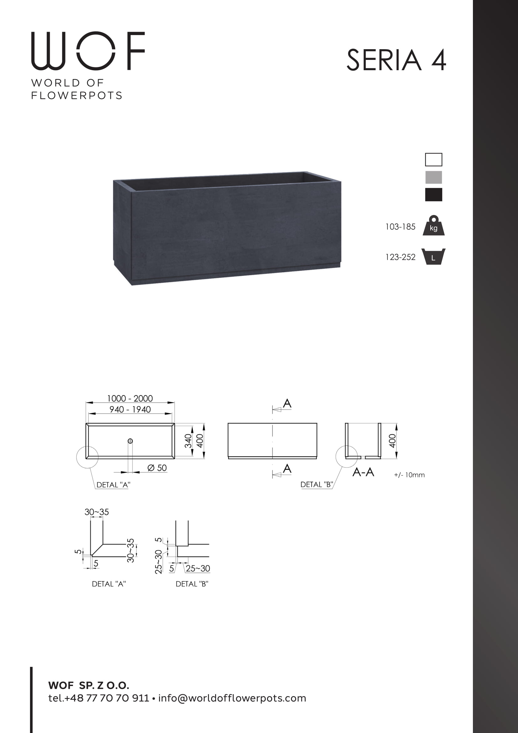 Eine zusätzliche Besonderheit des Seria 4 Beton Blumenkasten ist das individuell anpassbare Fassungsvermögen, das mit der Wahl der Länge des Kastens von 1000 bis 2000 mm erweitert werden kann. Das macht den Pflanzkübel Beton noch einmal flexibler gegenüber seiner Umwelt und der Bepflanzung. Mit dem Seria 4 erwerben Sie aufgrund seines robusten Materials außerdem ein wahres Qualitätsprodukt. Der Betonstein garantiert eine lange Lebensdauer. Der Pflanzkübel Beton ist des Weiteren frostbeständig sowie UV-resistent und somit sowohl für den Garten als auch für den Wintergarten einwandfrei geeignet. Bepflanzt hat der Seria 4 durch sein Betonmaterial zudem ein starkes Eigengewicht. Zusammen mit seiner schnittigen, ebenen Form kann daher auch ein schwerer Sturm den Beton Blumenkasten nicht aus seiner Balance bringen. Dadurch hält der hartnäckige Pflanzkübel Beton Wind und Wetter stand. Aufgrund dessen und durch die individuell festlegbare Länge kann der Beton Blumenkasten im Außenbereichen auch super als Begrenzung verwendet werden, beispielsweise bepflanzt mit Kräutern als Säumung von Beetbereichen. Insgesamt ist der Seria 4 die perfekte Wahl sowohl für die kreative Gestaltung des Gartens als auch zum Ausschöpfen praktischer Möglichkeiten.