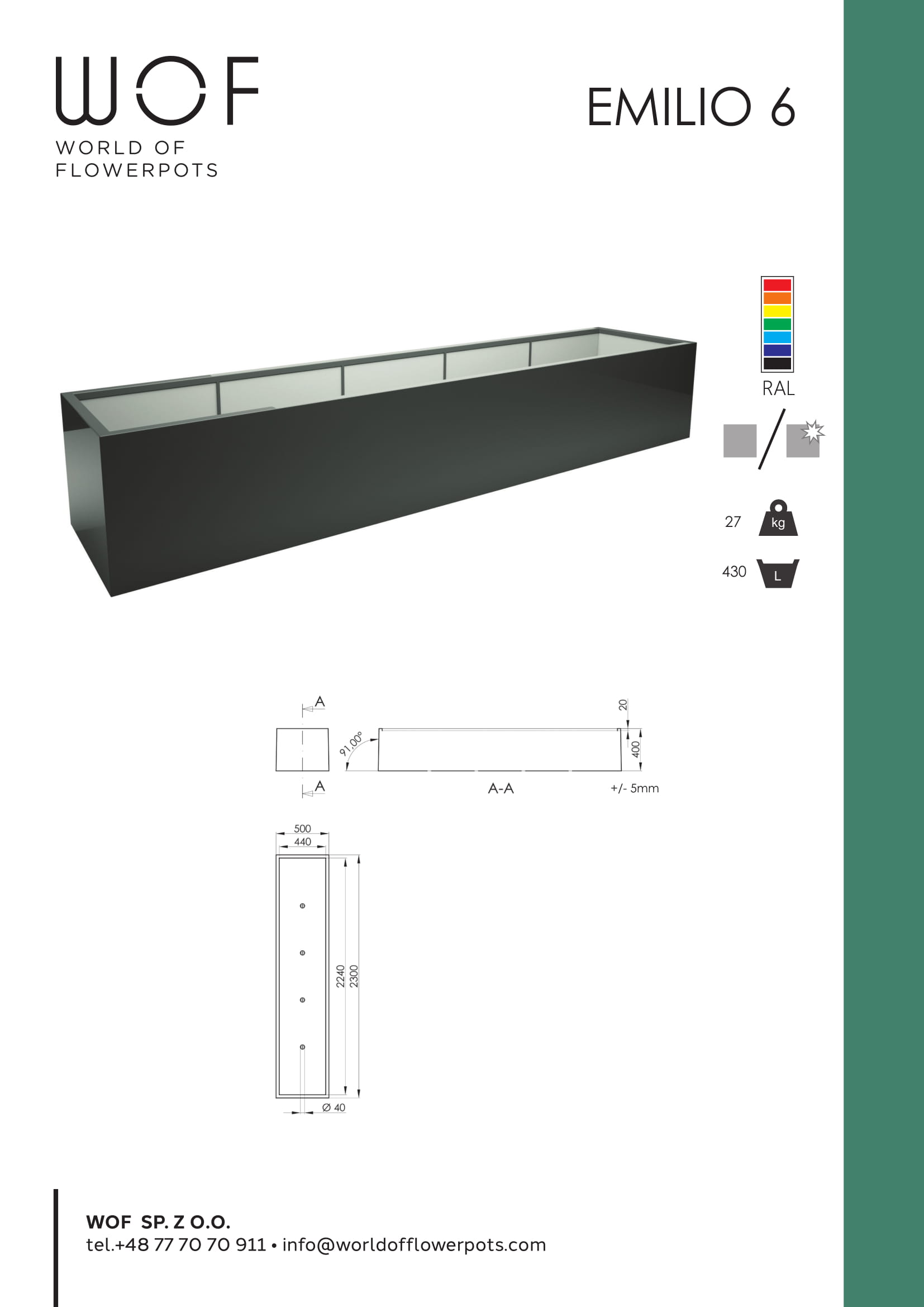 Producenci zachęcają architektów jak i osoby indywidualne do zakupu fikuśnych kształtów, wzorów czy innych zwracających na siebie elementów w jakie mogą się oblec długie donice z włókna szklanego. Donica Emilio 6 NIGDY NIE WYCHODZI Z MODY, jest unikalna w swej prostocie jak i klasycznym kształcie. Dlatego, jeśli sądzisz, że ta donica może nie wpasować się w projektowaną koncepcję z pewnością możesz być spokojny.