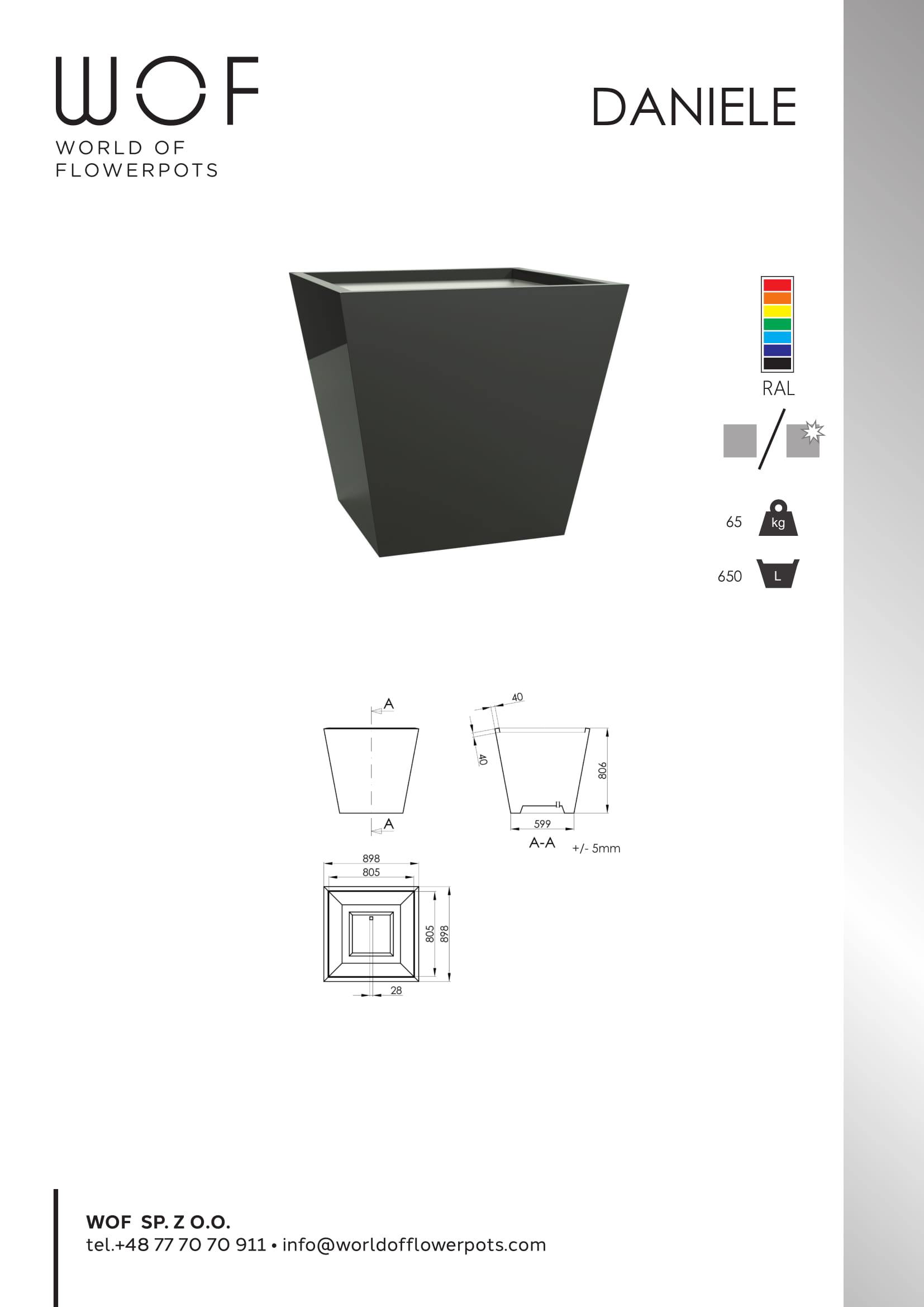 Daniele to donica trapezowa z aluminium. O jej uroku stanowią proste formy, dobrej jakości materiał i spore możliwości aranżacyjne. Donica może być świetnym punktem wyjściowym na przykład do urządzenia wnętrza w stylu minimalistycznym. Tak modne teraz odcienie szarości w połączeniu z zieloną roślinnością i z białymi dodatkami będzie stanowić zgrany duet. Wybierając ten model można mieć pewność, że producent zadbał o wszystkie istotne detale. Daniele, jest odporna na działanie czynników zewnętrznych, ma nie dużą wagę i posiada otwór odpływowy.