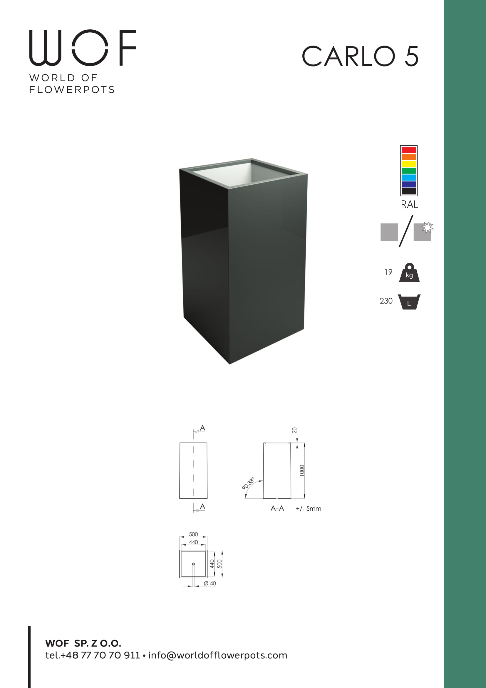 Model Donica Carlo 5 to wytrzymałe i uniwersalne naczynie. Donica wykonana jest z włókna szklanego oraz żywicy. Model Carlo 5 dostępny jest we wszystkich kolorach palety RAL w połysku i macie. Carlo 5 może być zastosowany jako donica lub jako osłonka. Standardowo donice są wyposażone w otwory odpływowe w dnie, jednak na życzenie klienta naczynie może zostać wykonane bez otworu odpływowego. Boczne ścianki donicy wyłożone są dwucentymetrową warstwą styropianu. Wymiary donicy: długość: 50 cm, szerokość: 50 cm, wysokość: 100 cm.