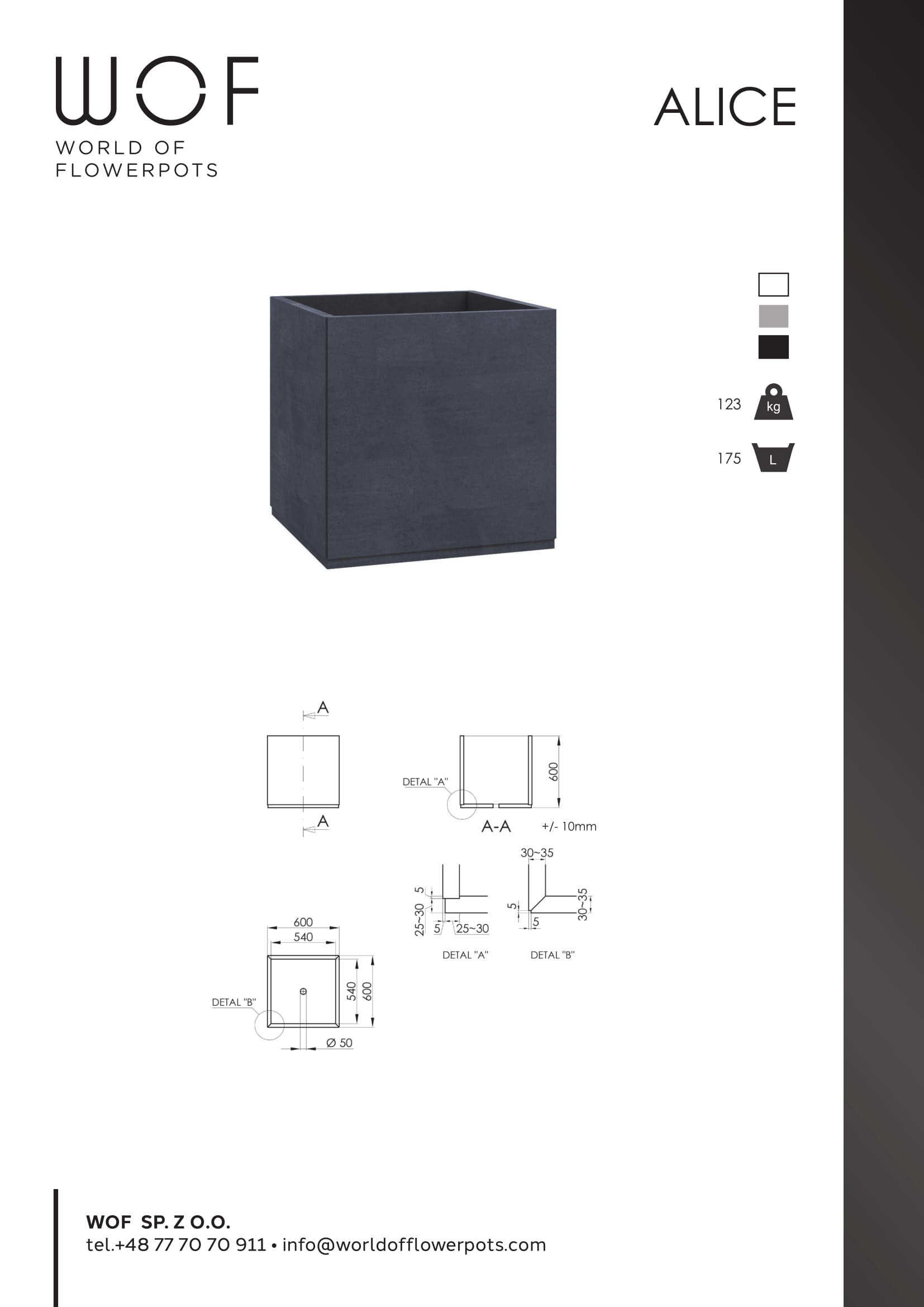Donice z betonu architektonicznego Alice są produktem najwyższej jakości. Łączą w sobie niezastąpione walory tak wytrzymałego materiału, jakim jest beton z niesłychaną elegancją nowoczesnych donic. Innowacyjny kształt oraz uniwersalne kolory bieli, czerni i szarości sprawiają, że donice betonowe są jednym z najmodniejszych elementów ozdobnych. Świetnie sprawdzają się w przestrzeni miejskiej, w przestrzeni użyteczności publicznej, jak również w prywatnych domach, ogrodach i tarasach.
