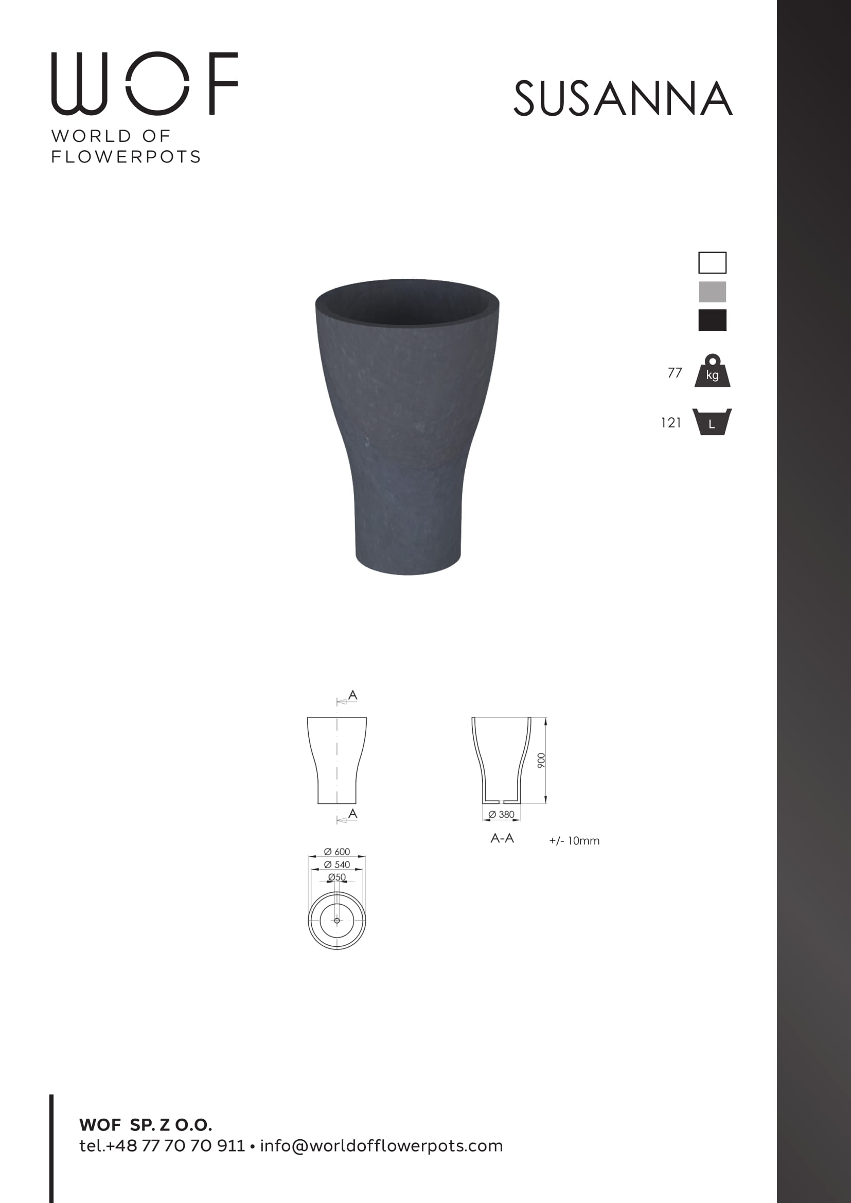 Donica Susanna wykonana z ultra betonu, dostępna jest w trzech klasycznych kolorach: czarnym, białym oraz szarym. Wymiary to: wysokość: 90 cm, średnica: 60 cm i waga: 66 kg. Donice betonowe na taras powinny spełniać funkcje praktyczne, funkcjonalne i estetyczne. Dlatego też, donica Susanna łączy elegancję z praktycznością. Kształtem nawiązuje do klasyki: jest wysoka i smukła. Łagodne linie projektu donicy, solidny materiał i staranne wykończenie produktu pozwalają na wykorzystanie jej do eleganckiej aranżacji przestrzeni wypoczynkowej.