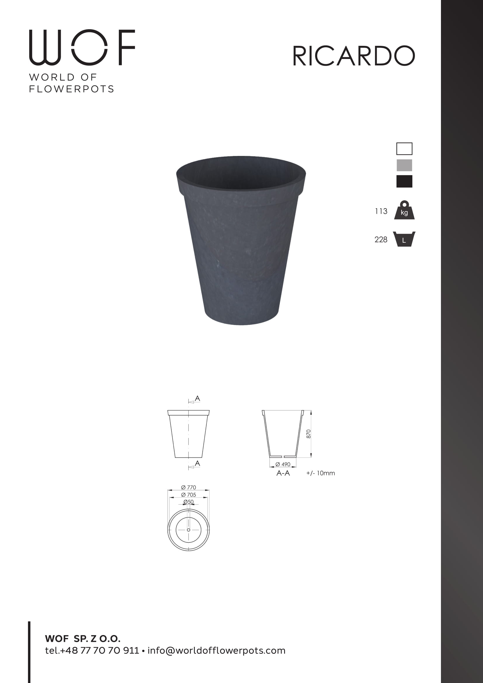 Donice Ricardo są w trzech uniwersalnych kolorach: białym, szarym i czarnym. Taki zestaw kolorystyczny to dobre tło dla zieleni we wszystkich jej odcieniach. Przy tym wszystkie trzy kolory dobrze dopasują się do wszelkich barw fasad.