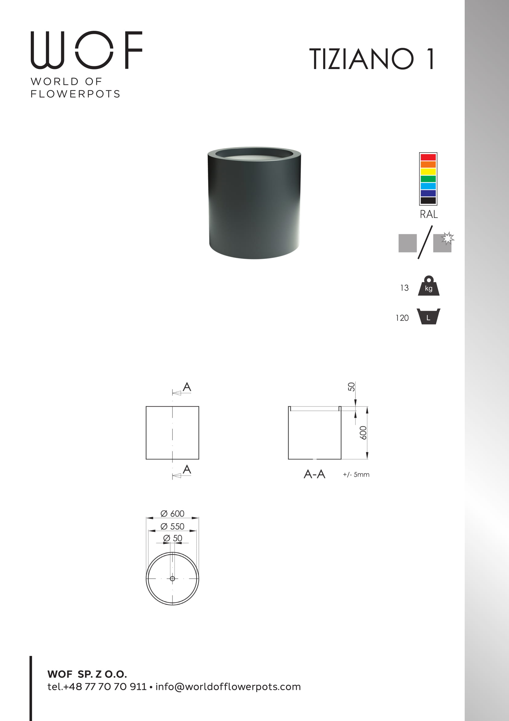 Donice okrągłe z aluminium Tiziano 1 idealnie nadają się do stosowania zewnętrznego. Charakteryzuje się niewielkimi rozmiarami i kształtem walca. Waży jedynie 13 kilogramów. Średnica podstawy to 60 cm, a wysokość również 60 cm. Objętość donicy to 160 litrów. Produkowana jest w standardzie z otworami odpływowymi – zapewnia to prawidłowe odprowadzenie nadmiaru wody na zewnątrz donicy. Donica dostępna jest we wszystkich kolorach palety RAL, dzięki czemu gama oferowanych barw jest bardzo szeroka. Jest przeznaczona do użytku jako donica tarasowa, ale świetnie sprawdzi się również do zastosowania w ogrodach oraz wnętrzach.