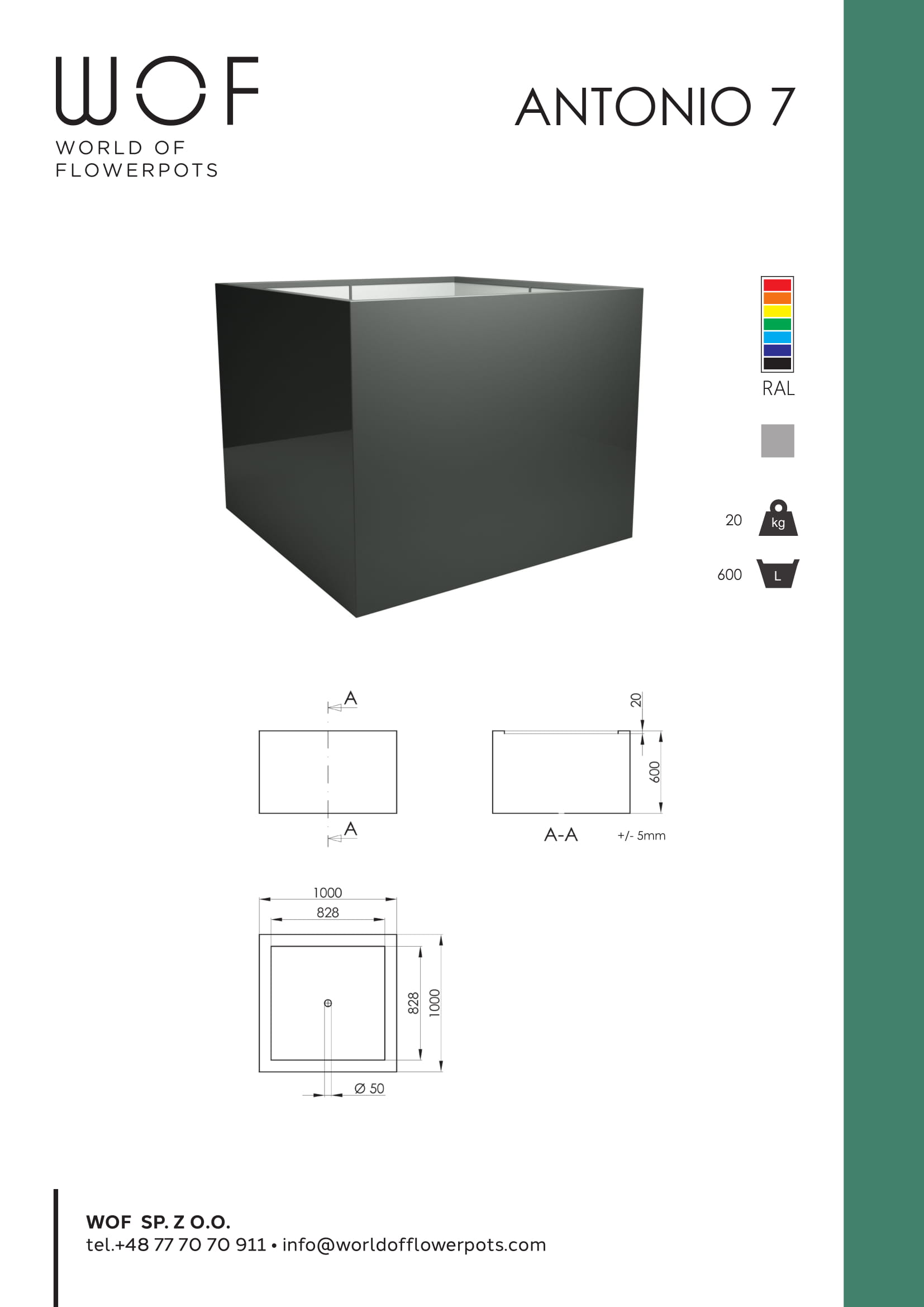 Antonio 7, to połączenie harmonii, elegancji, stylu i klasy. Donica o dużych wymiarach i kształcie sześcianu jest doskonałą propozycją dla osób ceniących sobie współczesne trendy. Produkt odnajdzie się między innymi w przestrzeniach publicznych. Restauracyjny ogródek, hol biurowy czy też hotelowa recepcja, to idealnie miejsce dla Antonio 7.