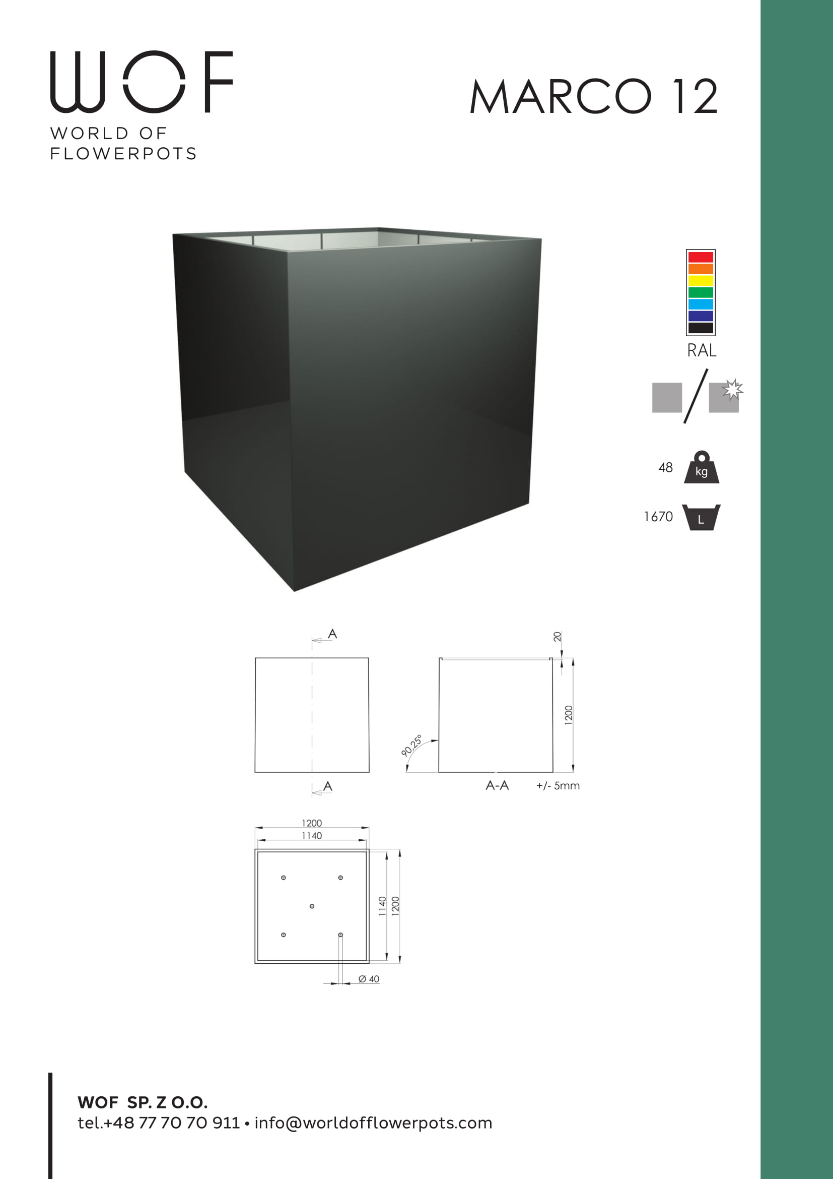 Donica plastikowa Marco 12 jest wykonana z bardzo wytrzymałego i odpornego na uszkodzenia, włókna szklanego oraz z żywicy. Elementy tworzące tą solidną konstrukcję połączone są ze sobą w idealnych proporcjach, co przekłada się na jej wytrzymałość. Może być zatem śmiało stosowana zarówno w zaciszu domowych wnętrz jak i służyć jako osłonka w ogrodzie, tarasie lub na balkonie. Klasyczny, prosty, a zarazem bardzo subtelny kształt donicy Marco 12 sprawi, że wpisze się ona z powodzeniem w aranżację każdego zielonego otoczenia. Dodatkowo wyposażona jest ona w otwory odpływowe w dnie, które na życzenie klienta nie muszą być wykonane. Wyłożenie bocznych ścian donicy styropianem, zapewnia dodatkowe wzmocnienie i ochronę termiczną umieszczonych w niej roślin. Doniczki plastikowe duże cechują się wybitną wytrzymałością i odpornością na uszkodzenia. Pomimo dużych gabarytów jej odbiór wizualny oddaje ukrytą w niej delikatność i zaskakującą lekkość.
