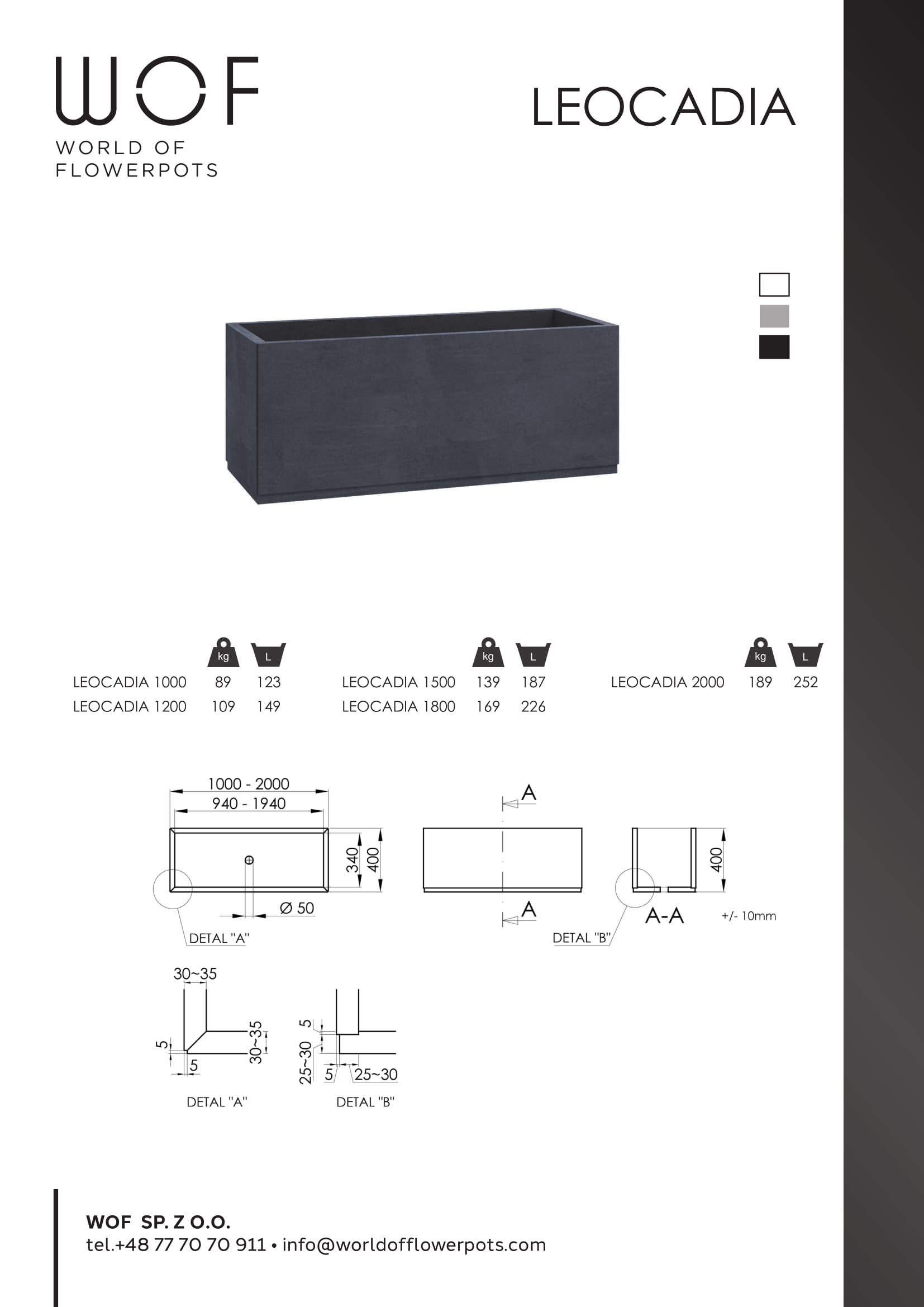 Prostokątna donica z betonu architektonicznego Leocadia charakteryzuje się przede wszystkim ponadczasową stylistyką oraz uniwersalnym kształtem. Dzięki temu fantastycznie się prezentuje i umożliwia kreatywną aranżację przestrzeni, ponieważ dopasuje się do różnego rodzaju ogrodów. Przy czym istnieje możliwość zamówienia donicy w jednej z pięciu długości, co ułatwia hodowlę roślin oraz pozwala ciekawie zagospodarować nawet bardzo duże powierzchnie zewnętrzne. Ponadto klasyczny design i wysoka jakość wykonania sprawia, że donica doskonale wygląda przy wejściu do budynku firmy. Świetnie wygląda także w domowych ogrodach, czy też dziedzińcach, należących do instytucji publicznych.