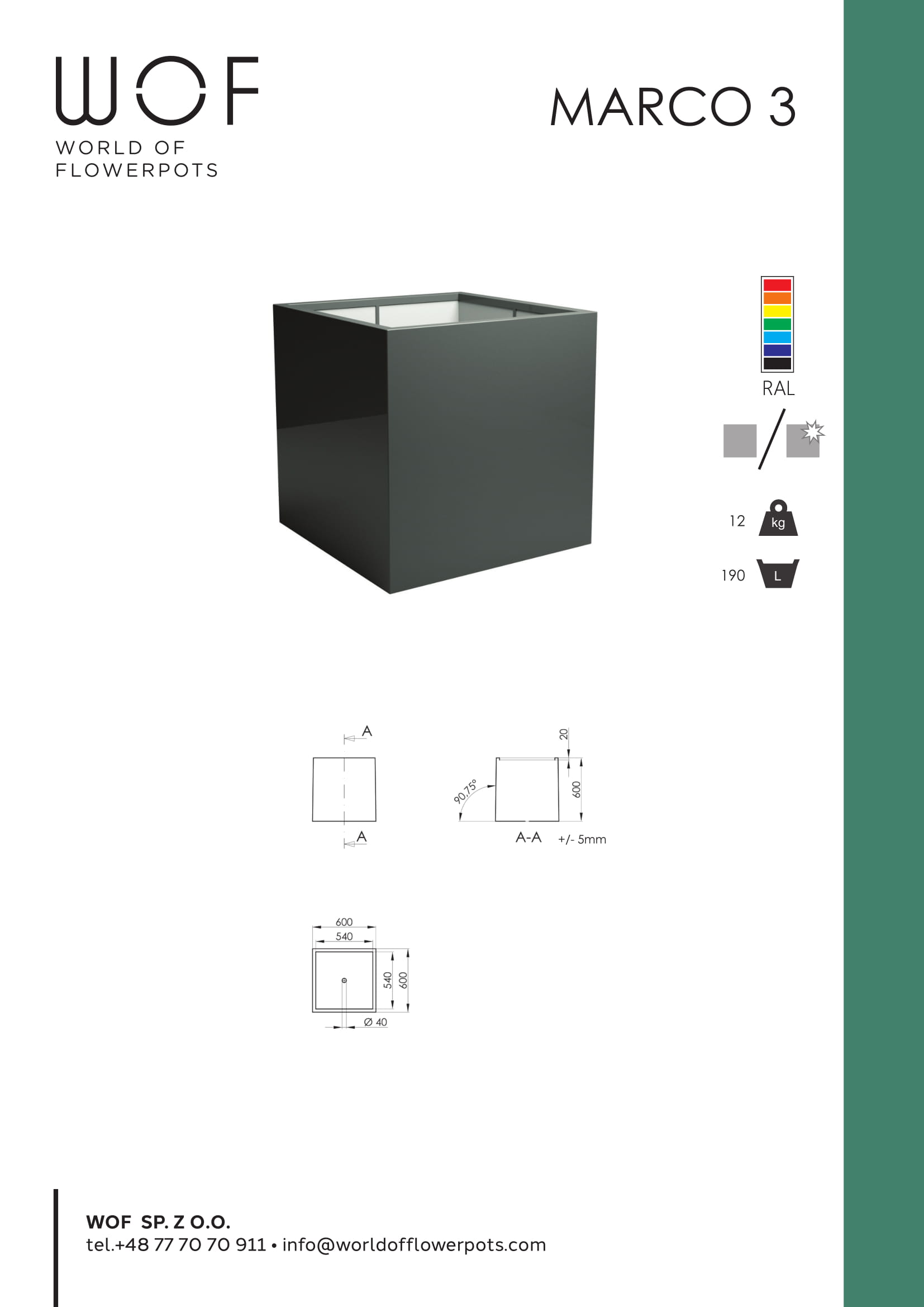 Der fiberglas pflanzkübel Marco 3 ist sozusagen der „größere Bruder” des Kübels Marco 1 aus der beliebten Marco-Reihe. Wie auch sein „kleinerer Bruder” ist der Pflanzenkübel Marco 3 ebenfalls würfelförmig gebaut. Jede der Seiten ist 60 Zentimeter lang. Die Höhe des Gefäßes beträgt ebenfalls 60 Zentimeter. Bei einem Fassungsvermögen von insgesamt 160 Liter bringt Marco 3 gerade einmal 16 Kilogramm Eigengewicht auf die Waage.