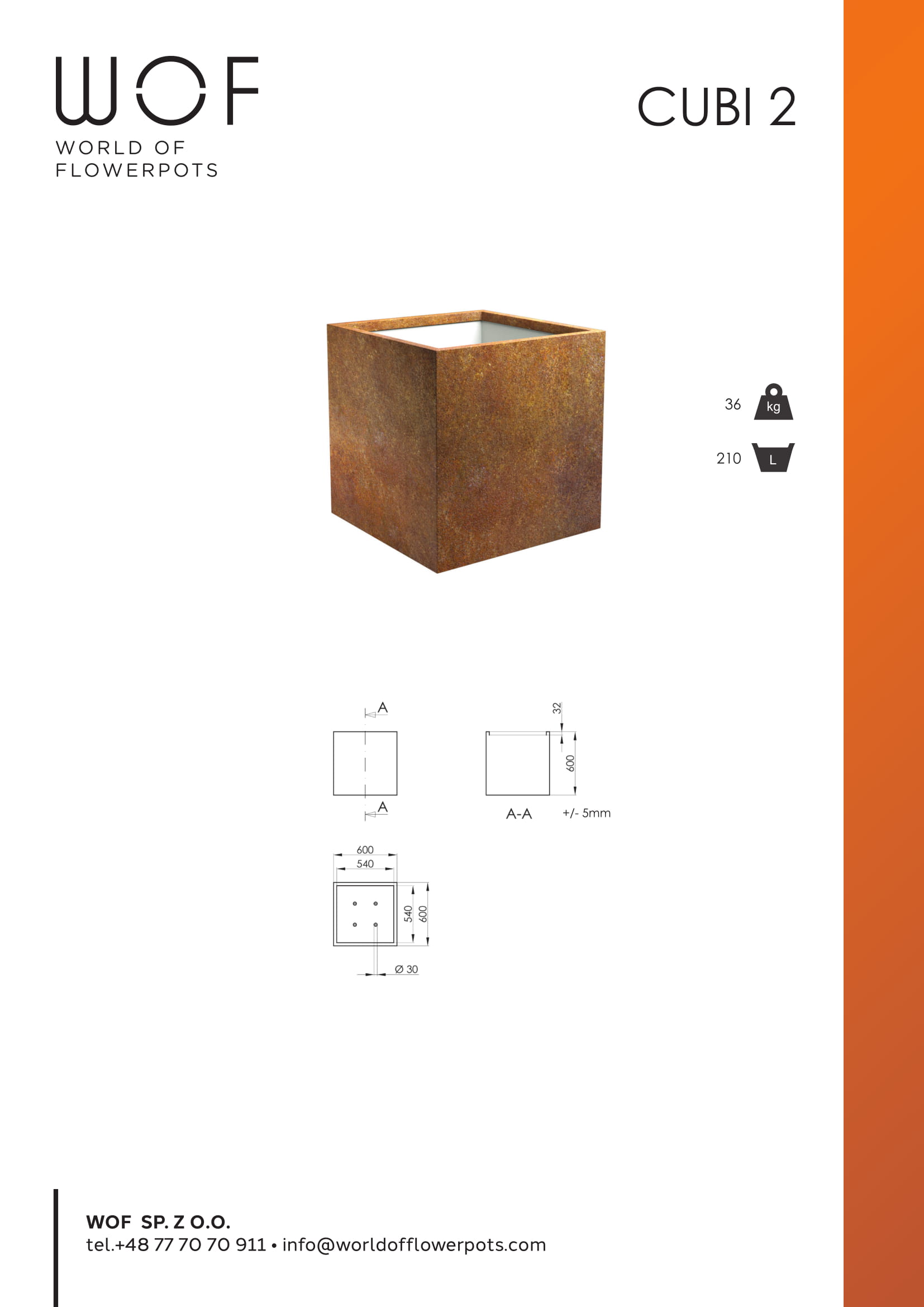 W ogrodzie panują bardzo różne i nie raz trudne warunki pogodowe, a kwadratowa donica z kortenu doskonale sobie z nimi poradzi. Wykorzystanie stali zawierającej odpowiednią mieszankę pierwiastków, które tworzą szczelną i trwałą powłokę, dają właściwości antykorozyjne. Kolejną zaletą jest fakt, iż grube na 2 mm ścianki donicy pozwolą cieszyć się długą żywotnością i trwałością materiału. Donica posiada także ścianki ocieplone dwucentymetrową warstwą styropianu co na pewno przyczyni się do lepszej izolacji cieplnej dla bardziej wrażliwych na zimno roślin. Kwadratowy kształt i dość duża pojemność, bo aż 210 litrów pozwoli na stworzenie ciekawej aranżacji. Zarówno jedna duża roślina jak i kilka mniejszych – dobrze komponują się w donicy.