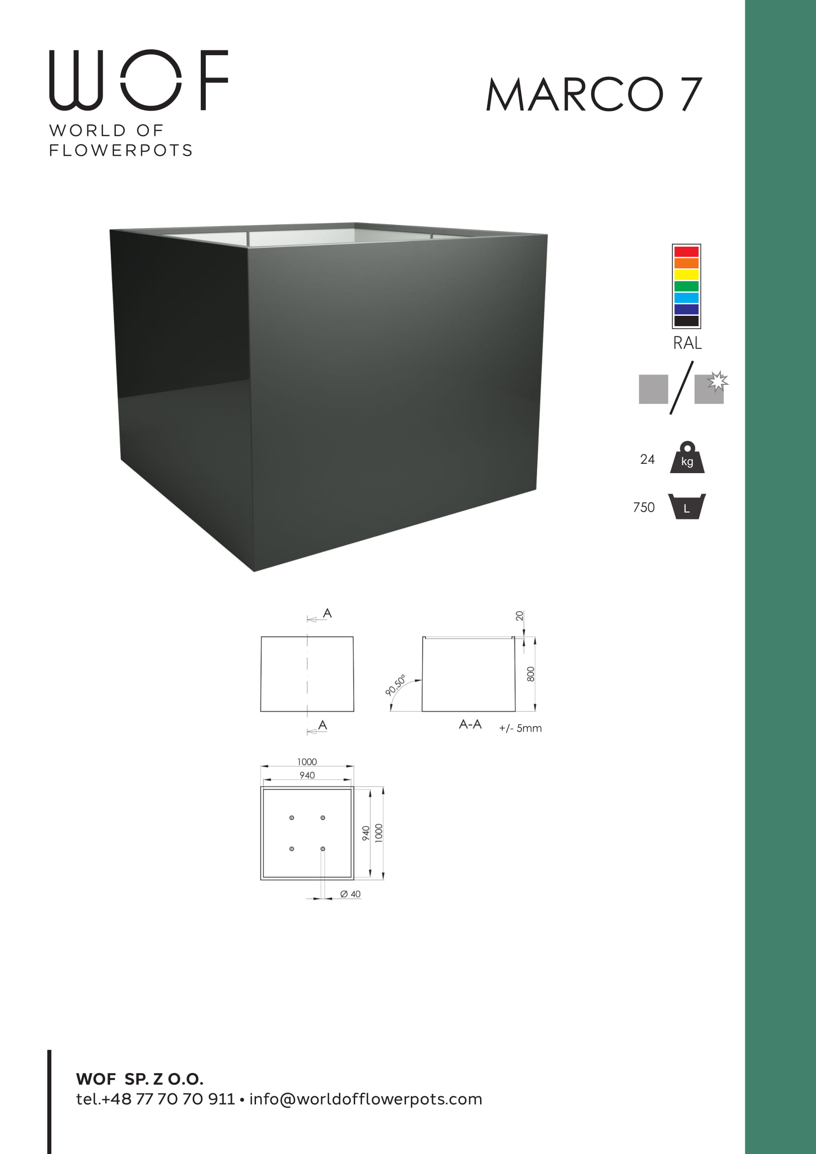 Donica z włókna szklanego Marco 7 to praktyczny dodatek, który możemy wykorzystać do stworzenia ciekawego wyglądu ogrodu, balkonu, tarasu. Jest ona wykonana z lekkich materiałów, które jednocześnie wytrzymają różne warunki pogodowe. Mogą bez problemu stać cały rok na zewnątrz i nic się z nimi nie stanie. Można wykorzystać donice do zasadzenia ulubionych kwiatów, sukulentów oraz drzewek, które na pewno stworzą ciekawy klimat na zewnątrz. Zieleń wokół domu i mieszkania jest ukłonem w stronę natury, do której teraz każdy człowiek lgnie. W dużym mieście, gdzie nie zawsze mamy tyle zieleni ile byśmy chcieli, taras pełny sadzonek to piękna ozdoba oraz własny park za oknem. W ogrodzie można wykonać z dowolnej ilości doniczek całą alejkę bogatą w różnego gatunku kwiaty oraz drzewka. Kwadratowe donice plastikowe mogą służyć jako doniczki, ale też jako osłonki do doniczek. Są wykonywane z otworem oraz bez otworu na dnie w zależności od życzenia klienta.
