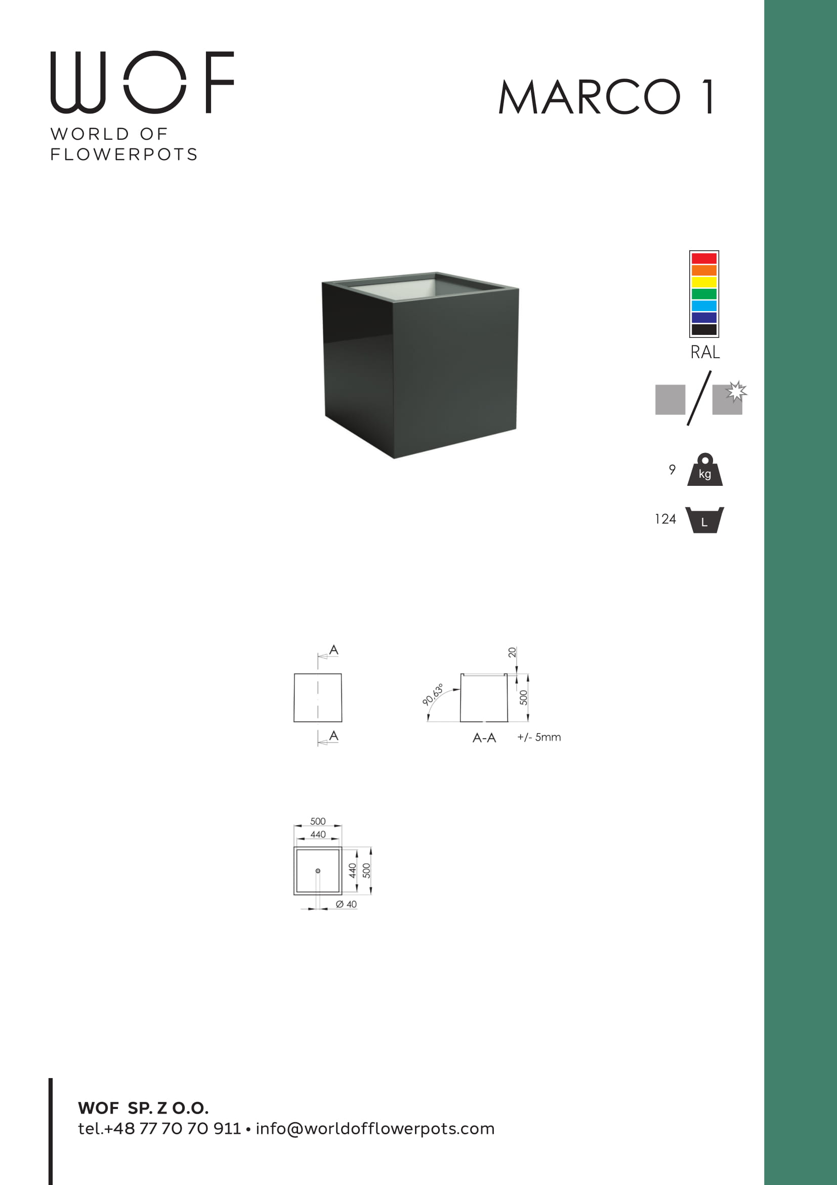 Donica Marco 1 wykonana jest z włókna szklanego oraz żywicy. Produkt może być wykorzystywany jako donica lub osłonka. Rynek oferuje duży wybór donic z różnego materiału, różnej jakości, oraz wzorach i kolorach. Nasza donica zyskuje coraz szersze grono osób zainteresowanych. Dzieje się tak dlatego, że jest ona bardzo wytrzymała, lekka i doskonale przedstawia się w nowoczesnych, modernistycznych wnętrzach. Włókno szklane jest lekkim materiałem, a to pozwala na łatwe przesuwanie nawet dużych modeli donic. Donice zaopatrzone są w otwory odpływowe w dnie, a ścianki boczne wyłożone są styropianem, co jest bardzo ważne dla roślin. Oferujemy szeroki wachlarz kolorów, zaczynając od klasycznych, eleganckich grafitów i szarości, przez stonowane, uspokajające zielenie, aż po soczyste żółcie i mocne, energetyzujące czerwienie. Wykorzystujemy najwyższej jakości pigmenty, które zapewniają doskonałe nasycenie barw oraz cieszą oko przez długi czas.