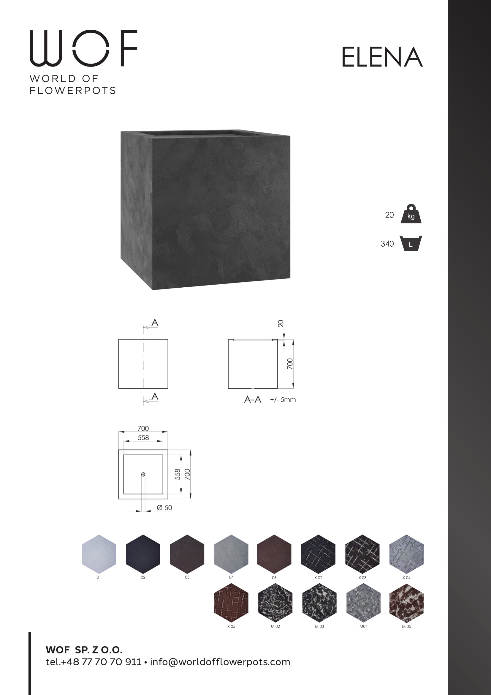 Donica Elena z nowatorskiej linii Stone została stworzona dla najbardziej wymagających użytkowników. Wykonana jest z włókna szklanego pokrytego kwarcem zmieszanym z żywicą akrylową. Pozwala jej to łączyć niezwykłą lekkość z elegancją. Sześcian o wymiarach 700x700xh700 mm doskonale wpasuje się w stylową aranżację ogrodu. Wierzchnia warstwa wykończenia nakładana jest ręcznie, co nie tylko zapewnia niepowtarzalność każdej donicy, ale również gustowny wygląd. Dzięki temu te lekkie donice ogrodowe przypominają wyglądem ciężkie kamienne bądź betonowe. Donica Elena dostępna jest w 5 kolorach jednolitych, a także w dwóch wzorach. W przypadku wzorów, można dodatkowo wybrać jeden z 4 kolorów.