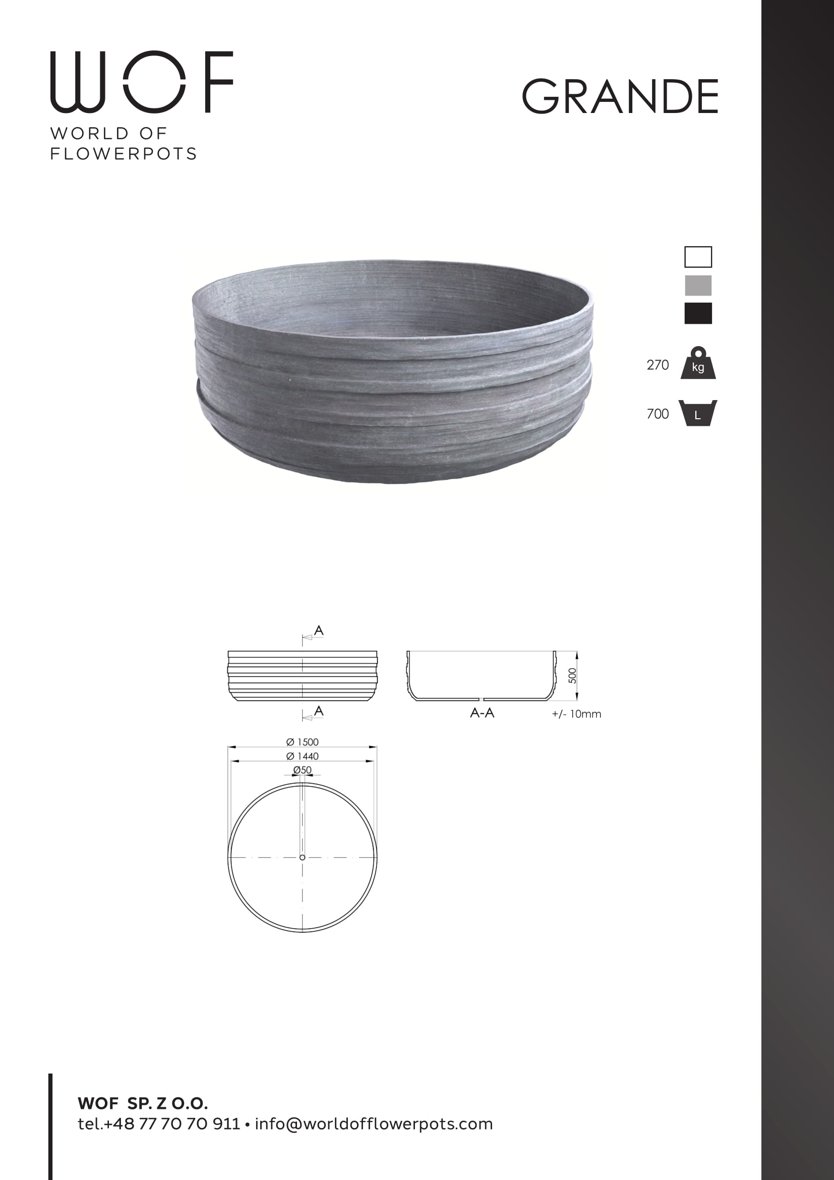 Der Pflanzkübel Beton rund Modell Grande besteht aus robustem Ultrabeton, einem nahezu unzerstörbaren Material. Die Modellbezeichnung Grande erhielt der Beton Pflanzkübel aufgrund seiner Größe. Mit einer Höhe von 50 Zentimetern und einem Durchmesser von 150 Zentimetern bietet das geräumige Pflanzgefäß ausreichend Platz für stattliche Solitärpflanzen oder komplette Minigärten. Das Gesamtvolumen des Blumenkübels beträgt 700 Liter, die maximale Belastbarkeit wird vom Hersteller mit 270 Kilogramm angegeben.
