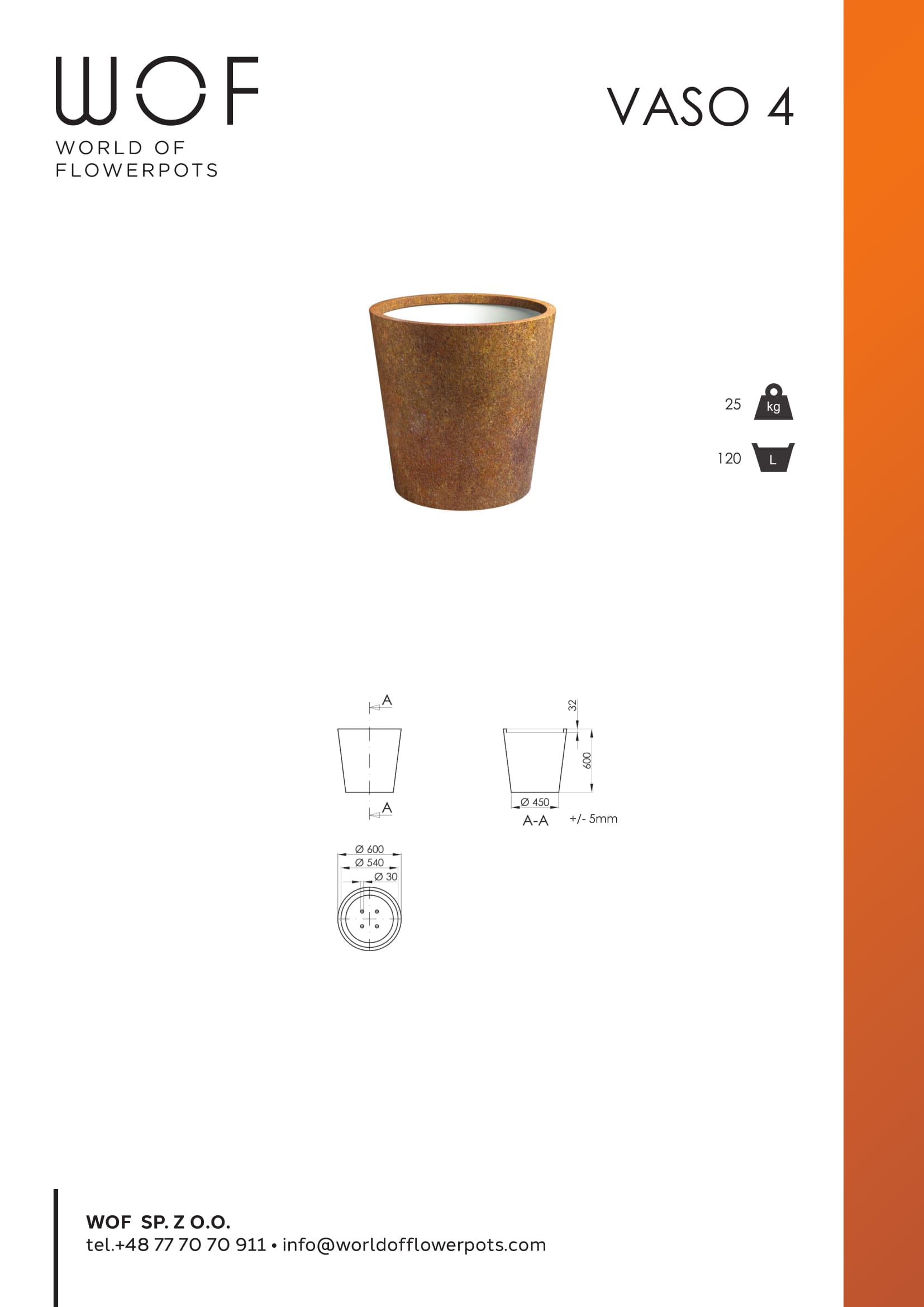 Aufgrund der feinen natürlichen Farbe Rost passt das aparte Modell Vaso 4 zu jeder Art von Pflanze. Tiefgrün, Hellgrün und auch rote Blattgewächse sowie laubabwerfende Holzgewächse lassen sich bestens zu diesem Kübel kombinieren. Der Vaso 4 kann daher sowohl in der Gruppe mit anderen Kübeln als auch alleine stehen. Der Vaso 4 ist mit 25 Kilogramm Eigengewicht auf jedem Boden standfest. Dennoch lässt er sich leicht von einer Stelle an die andere verschieben, so dass Gärtner mit der Serie Vaso ihren Garten nach Lust und Laune immer wieder neu arrangieren können. Insbesondere die Kombination mit anderen Modellen der Serie Vaso bietet einen reizvollen Look in einem natürlichen Rostton.