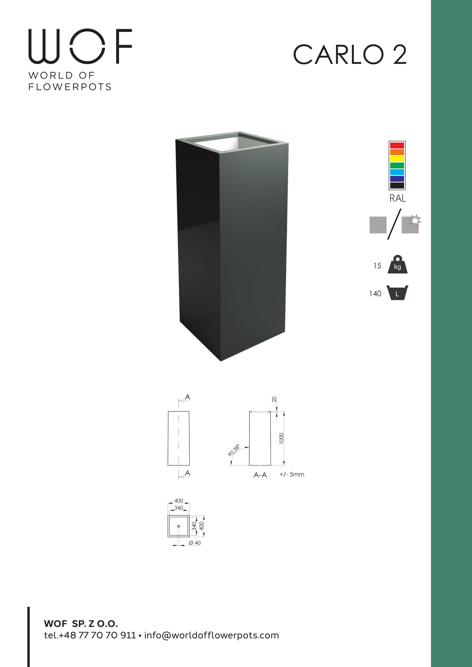 Der Pflanzenkübel Carlo 2 besteht aus Fiberglas und hat einen quadratischen Querschnitt. Beide Seiten sind je 40 Zentimeter lang. Die Höhe des Kübels beträgt 100 Zentimeter und er besitzt ein Fassungsvermögen von 140 Litern. Trotz dieses großen Volumens beträgt sein Gewicht lediglich 15 Kilogramm. Der Pflanzenkübel ist in mehreren Farben erhältlich, die man auf der Webseite auswählen kann. Ab einer Mindestbestellmenge von 4 Stück besteht die Möglichkeit, die Farbe individuell zu gestalten.