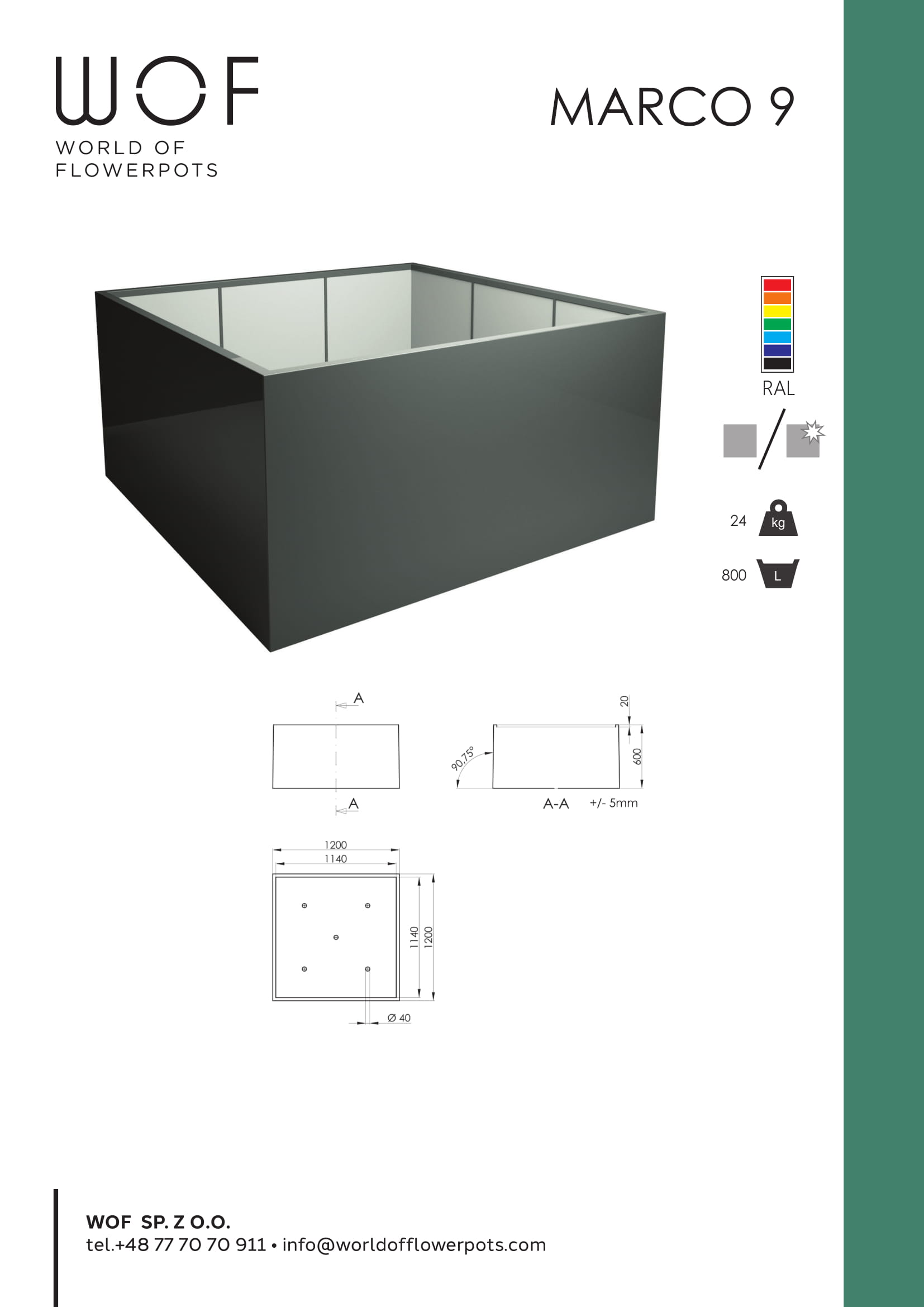 Die Form des Kübels ist quadratisch. An beiden Seiten misst er 120 cm, sodass er insgesamt ein Volumen von 800 Litern fassen kann. Mit einem Gewicht von 24kg ist es trotzdem ohne großen Aufwand möglich, den Kübel flexibel zu transportieren und nach Blieben zu positionieren. Hergestellt wird Marco 9 aus hochwertigem und robustem Fiberglas. Dieses Material überzeugt vor allem durch seine Langlebigkeit. Die Ecken und Kanten des Modells sind äußert hochwertig verarbeitet. Insgesamt macht der Pflanzenkübel, der in einer Vielzahl von Farben erhältlich ist, einen sehr eleganten und hochwertigen Eindruck.