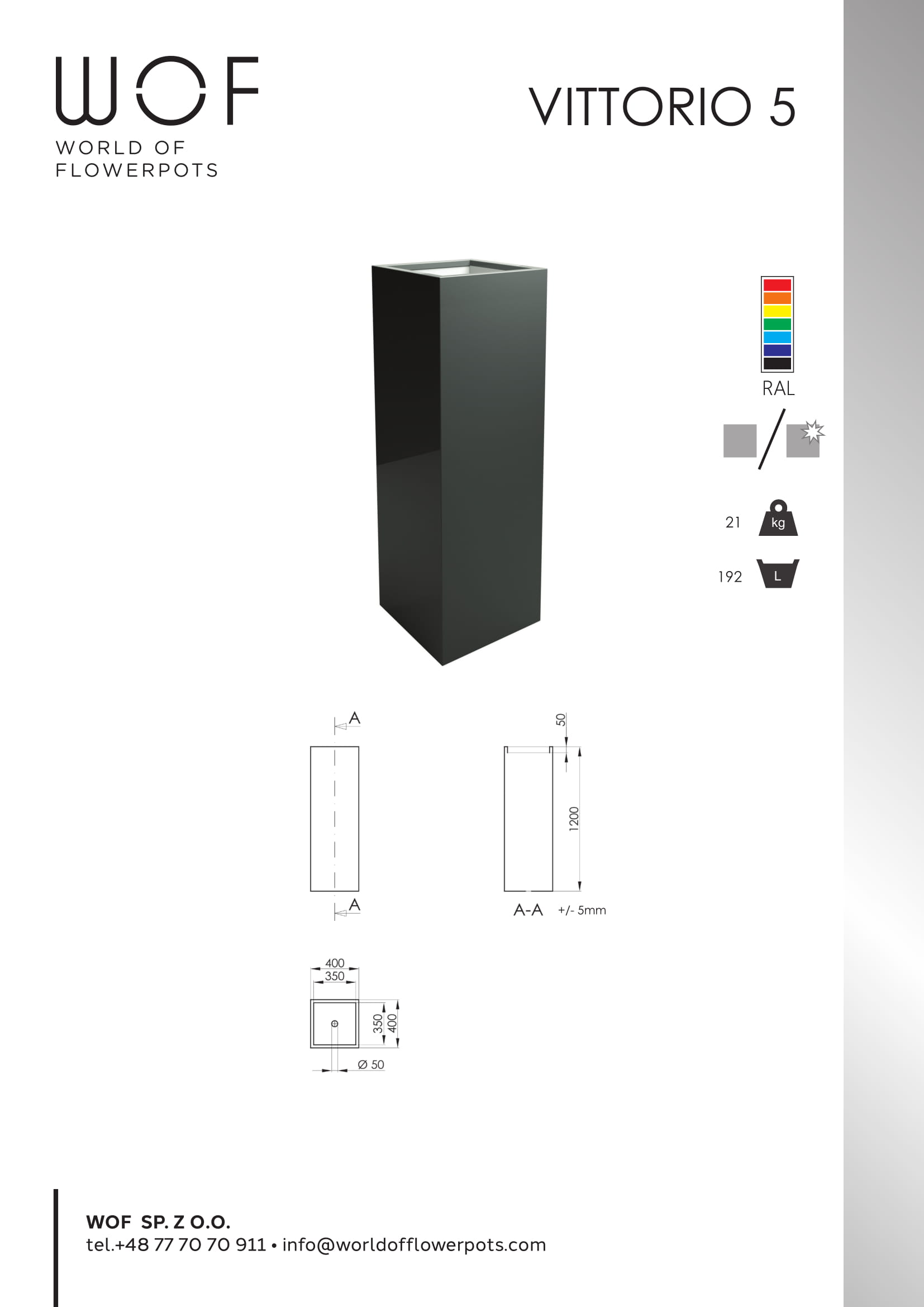 Mit einer Höhe von 1,20 m ist der Säulenkübel ein beeindruckendes Element zur Garten- und Terrassendekoration. Hohe Pflanztöpfe wie der Vitorio 5 eignen sich schön bepflanzt auch ausgezeichnet zur Eingangsdekoration. Die elegante Pflanzsäule können Sie mit grünen oder blühenden Pflanzen mit Hängeranken oder Blühpflanzen der Jahreszeit schmücken. In einer Reihe aufgestellt eignen sich die Pflanzsäulen auch als Alternative zu einer kleinen Terrassenmauer. Bei Bestellungen von 5 Töpfen aufwärts können Sie die Kübel in jeder Farbe der RAL Tabelle bei uns online bestellen.