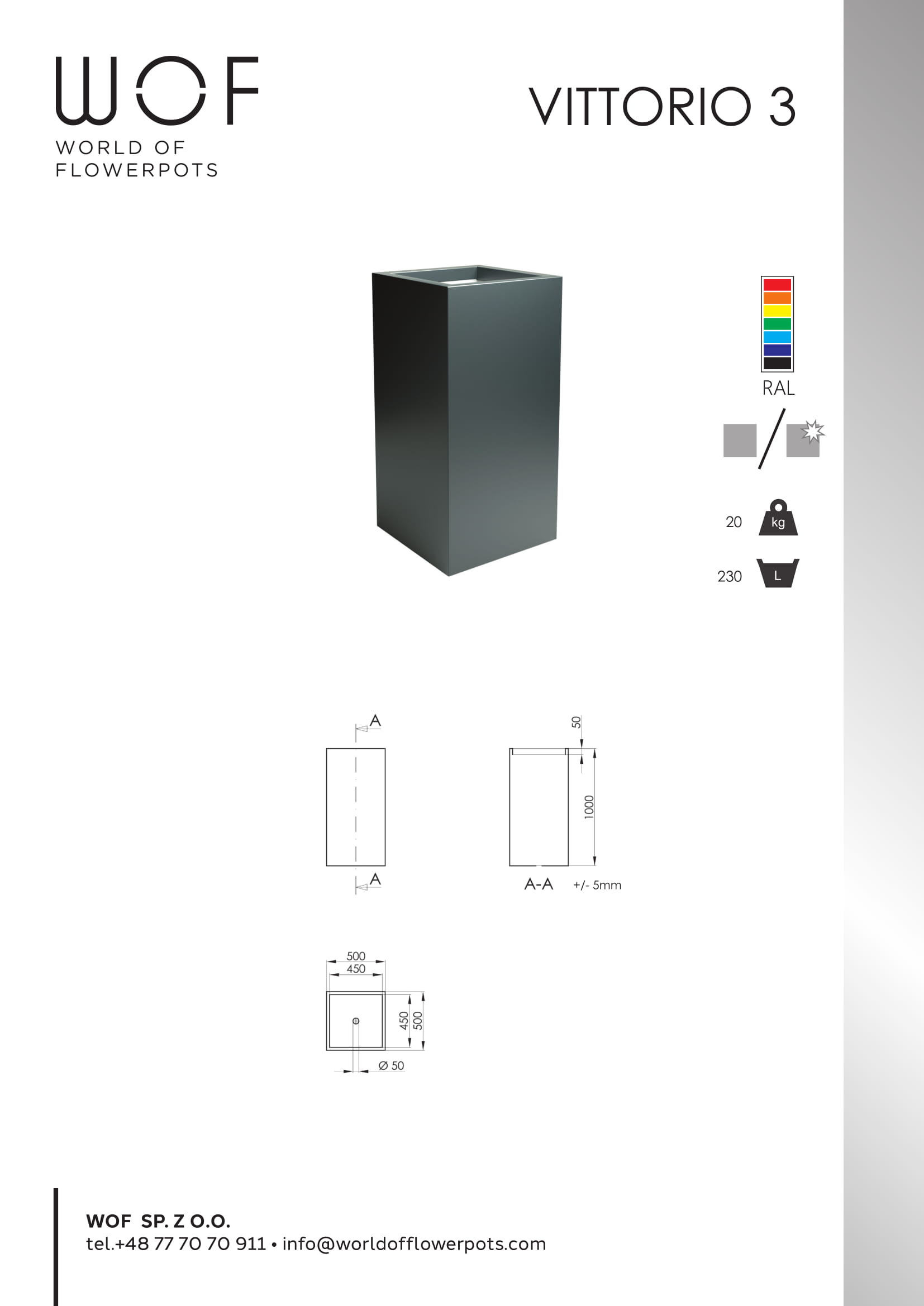 Nie tylko przydomowy taras będzie dobrym miejscem dla donicy Vittorio 3. Można postawić ją także przed wejściem do domu lub biurowca, a także w dużym holu. Donica będzie pięknie prezentować się w minimalistycznym wnętrzu, gdzie zastosowano szkło i metal w elementach wykończeniowych. Tym bardziej, że występuje w 3 kolorach: białym, szarym i czarnym.